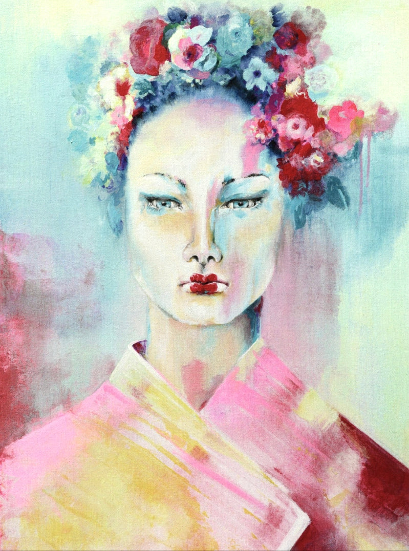 Entdecken Sie ein einzigartiges Kunstdruck auf Leinwand, das diese exquisite Darstellung einer Frau mit Blumen im Haar feiert. Dieses Porträt verbindet zeitlose Eleganz und lebendige Farben und bringt eine frische, inspirierende Atmosphäre in jeden Raum.